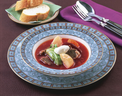 ビーツの色が特徴的な煮込み料理。ローリエが肉の臭みを消します。